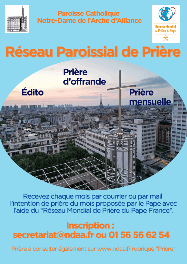 Chaque mois, nous envoyons par courrier ou par mail à ceux qui le souhaitent l’intention de prière du mois proposée par le Pape avec l’aide du Réseau Mondial de Prière du Pape France. Vous retrouvez également un édito qui accompagne cette intention, ainsi que la prière mensuelle et la prière d’offrande quotidienne. Il sera possible également de retrouver les intentions sur le site Internet de la paroisse www.ndaa.fr.